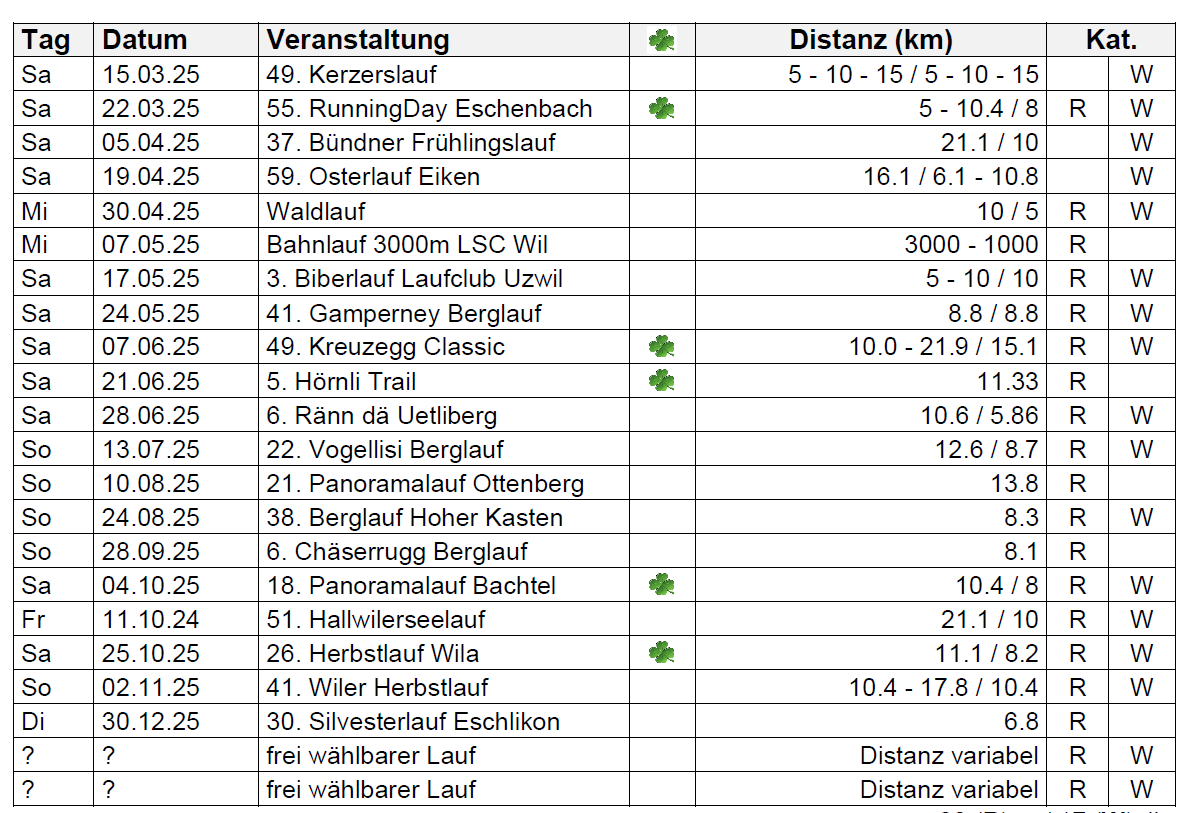 Alle Teilnehmenden müssen mindestens 4 Läufe aus der untenstehenden Liste absolvieren. Die besten 4